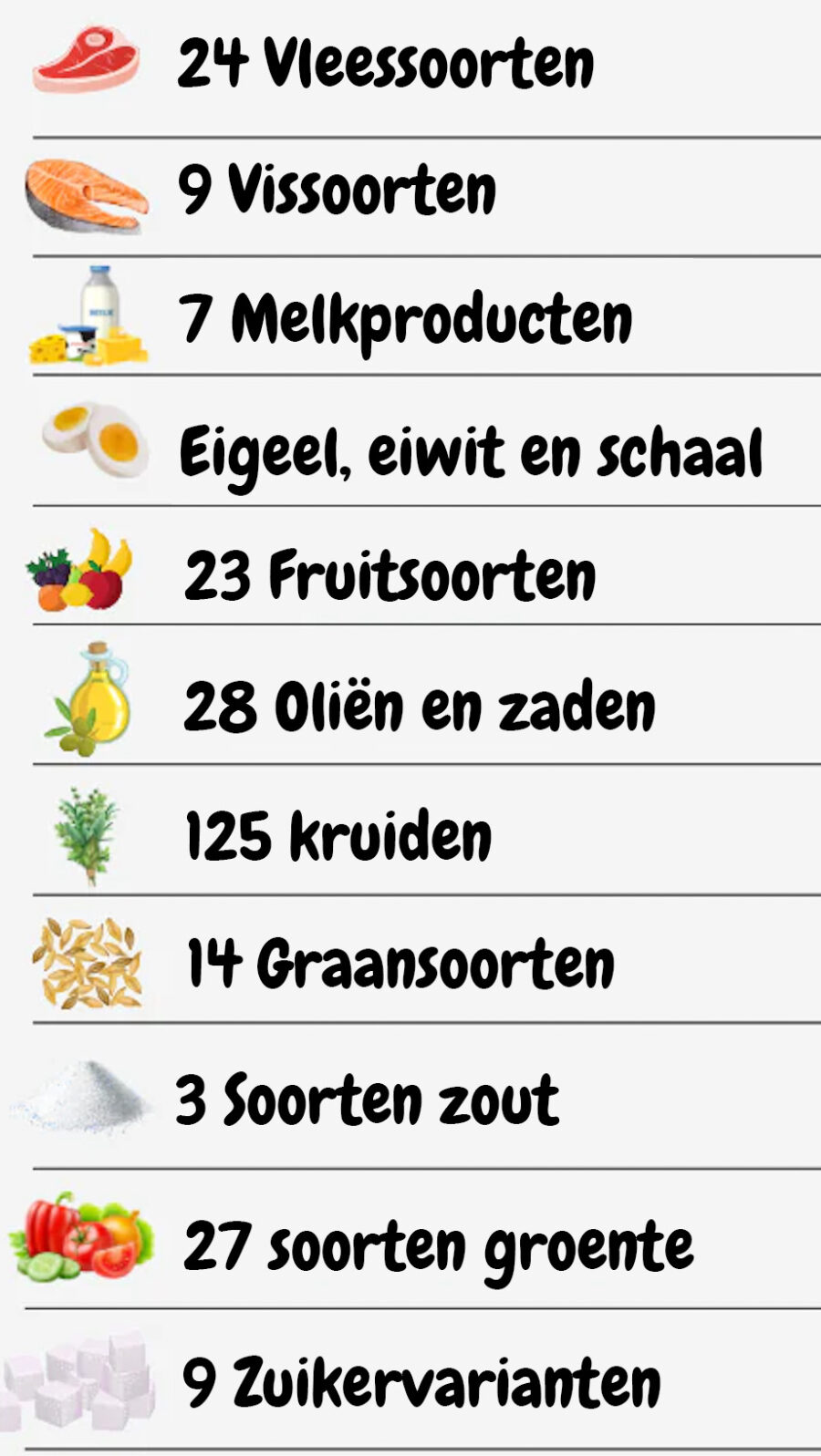 - De test omvat +300 voeringrediënten: vlees, vis, fruit en groenten