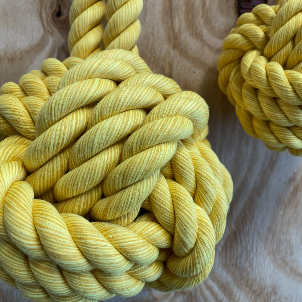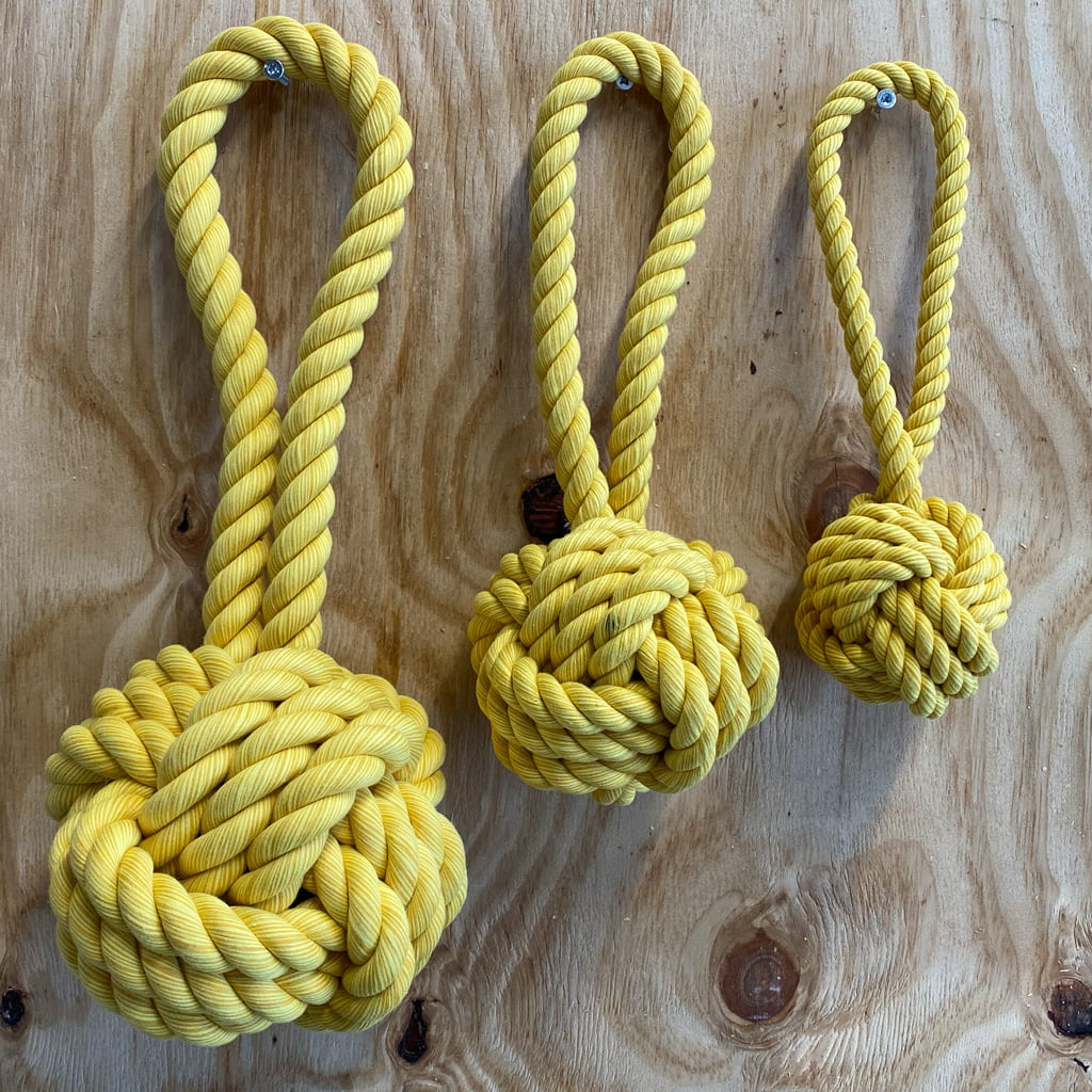 - Large: Gewicht 640 gram, lengte 37 cm, doorsnede bal 14 cm, dikte touw 2 cm