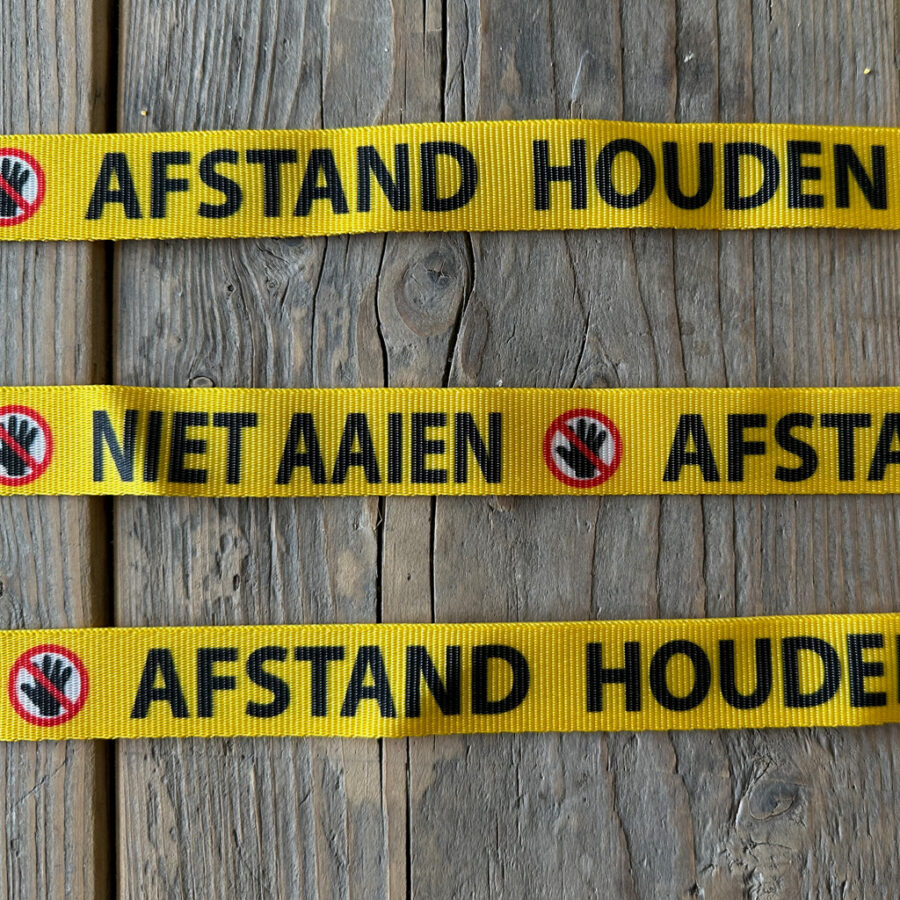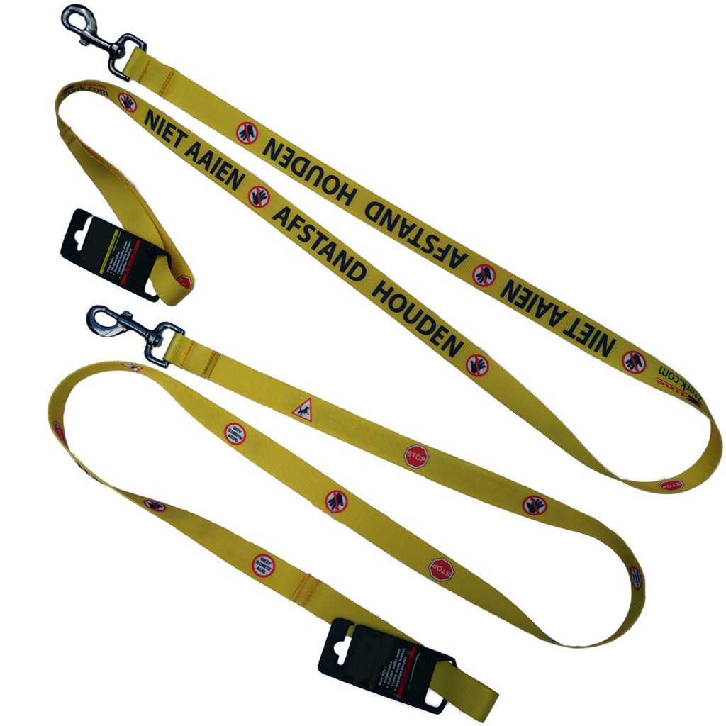Deze speciale zeer opvallende hondenlijn heeft de tekst "NIET AAIEN" en "AFSTAND HOUDEN" en tevens diverse signalen waaruit een ieder in 1 oogopslag kan zien dat het niet de bedoeling is in de buurt van de hond te komen.