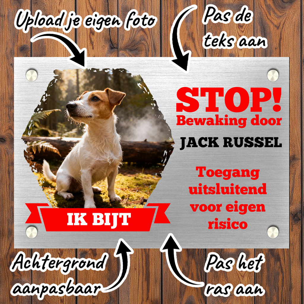Wil je een waakbord hond dat écht opvalt en past bij jouw huis of erf? Ons Gepersonaliseerd waakbord hond 10 is een luxe uitvoering gemaakt van stevig 3 mm dik alupanel. Uniek aan dit waakbord is dat je het volledig naar wens kunt samenstellen: van de foto van je eigen hond tot de tekst, het lettertype en zelfs de kleur van het geborstelde aluminium. Zo heb je altijd een waakbord op maat dat niemand anders heeft.