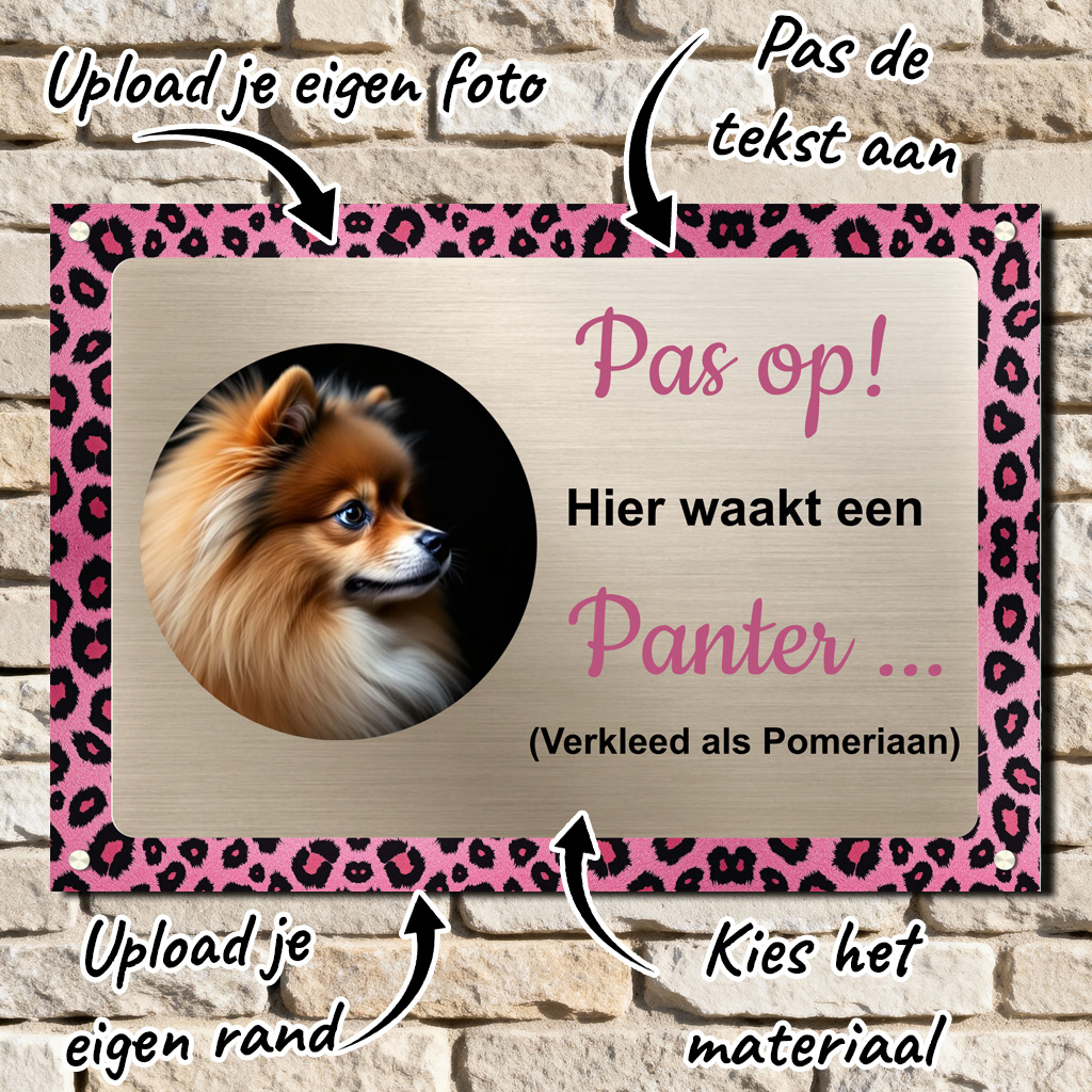 Dit waakbord (23 x 16 cm) wordt gemaakt van hoogwaardig alupanel en is verkrijgbaar in verschillende luxe uitvoeringen: zwart, brons, koper, goud of zilver geborsteld aluminium. Bij dit design zie je een deel van het gekozen luxe materiaal, wat direct zorgt voor een extra chique uitstraling. En dat met de foto van jouw hond – die je heel eenvoudig kunt uploaden. Dankzij onze professionele printtechniek drukken we jouw design haarscherp op het bord en werken we het standaard af met een UV-beschermlaag. Hierdoor blijft jouw waakbord jarenlang mooi, ook bij weer en wind.