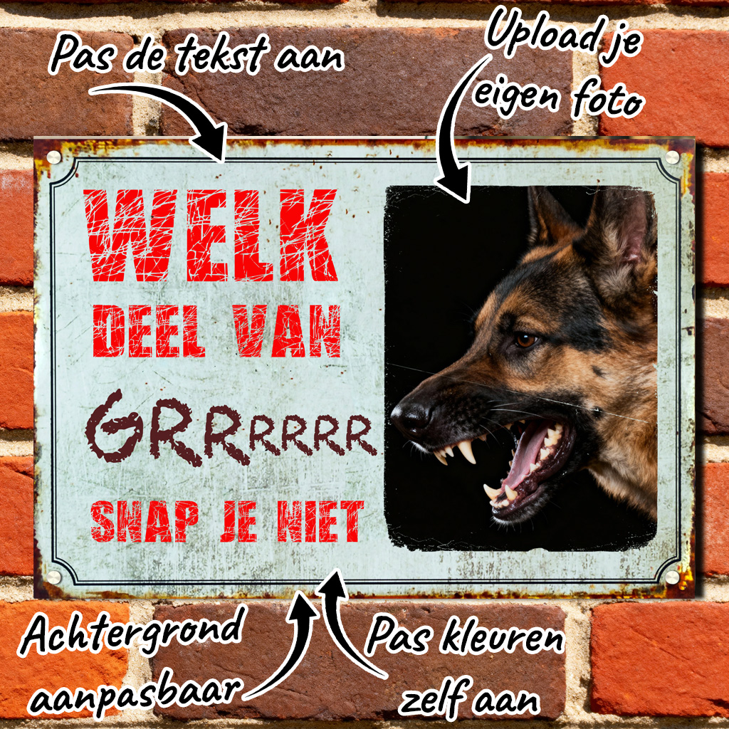 Geef jouw hond een eigen plek met dit gepersonaliseerd waakbord hond. Gemaakt van luxe geborsteld aluminium, haarscherp bedrukt en bestand tegen weer en wind. Volledig te personaliseren met foto, tekst en stijl – zo heb je altijd een uniek waakbord dat bij jou past.