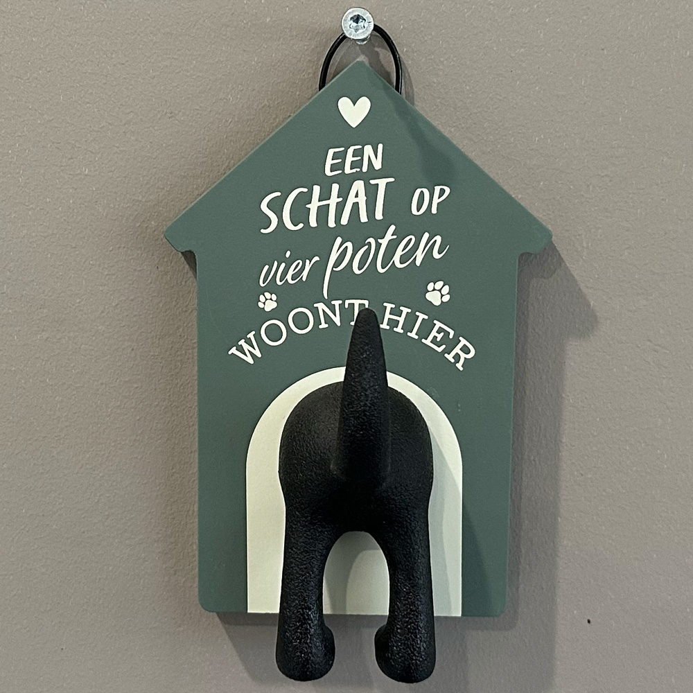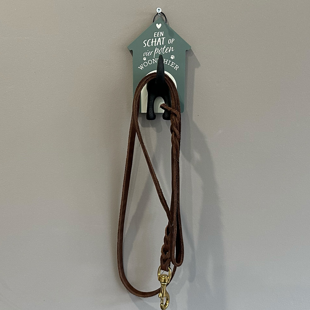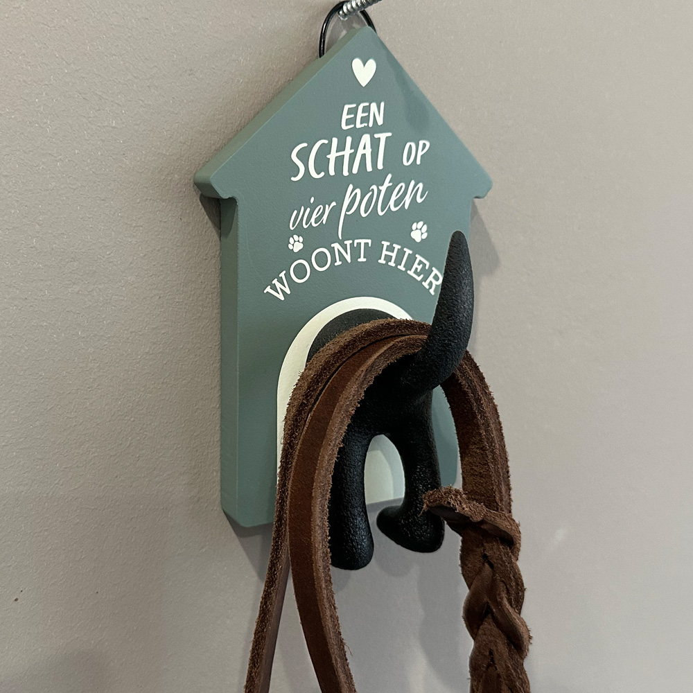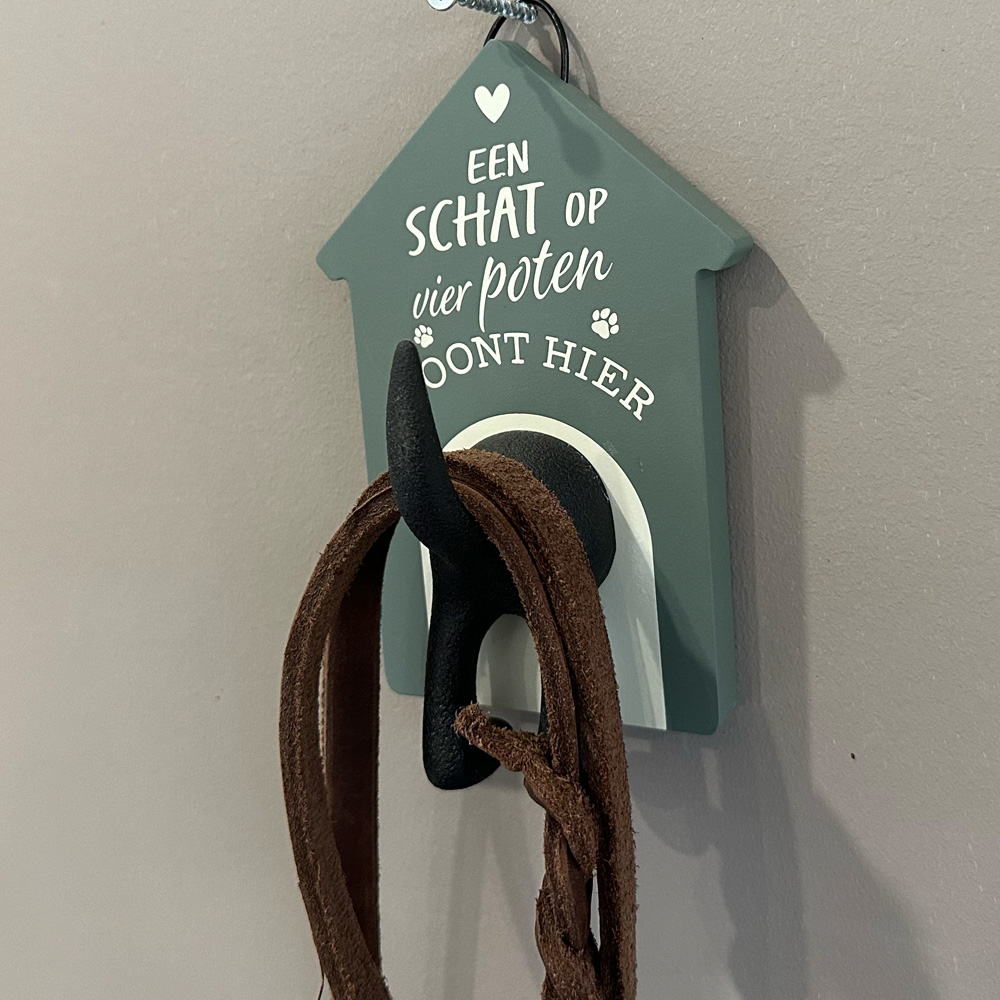 Hondenkapstok "Een schat" Hang de hondenriem op in stijl. Een bijzonder leuke hondenkapstok in moderne zachte kleuren die in elk interieur past. Grijp nooit meer mis door de hondenriem op een vaste plek weg te hangen. Wanneer je een hondenriem ophangt zal de riem ook sneller drogen bij nat weer wat we in dit land helaas vaak hebben….