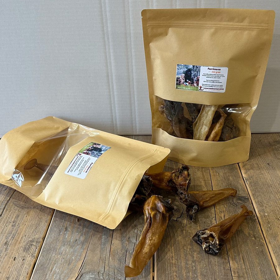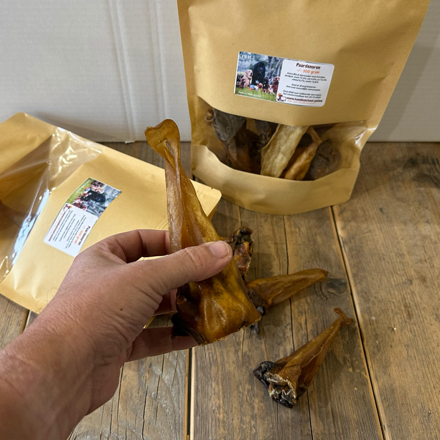 Je ontvangt 300 gram paardenoren zonder haar, zorgvuldig gedroogd zonder chemische behandelingen. Perfect als traktatie of beloning voor je trouwe viervoeter.